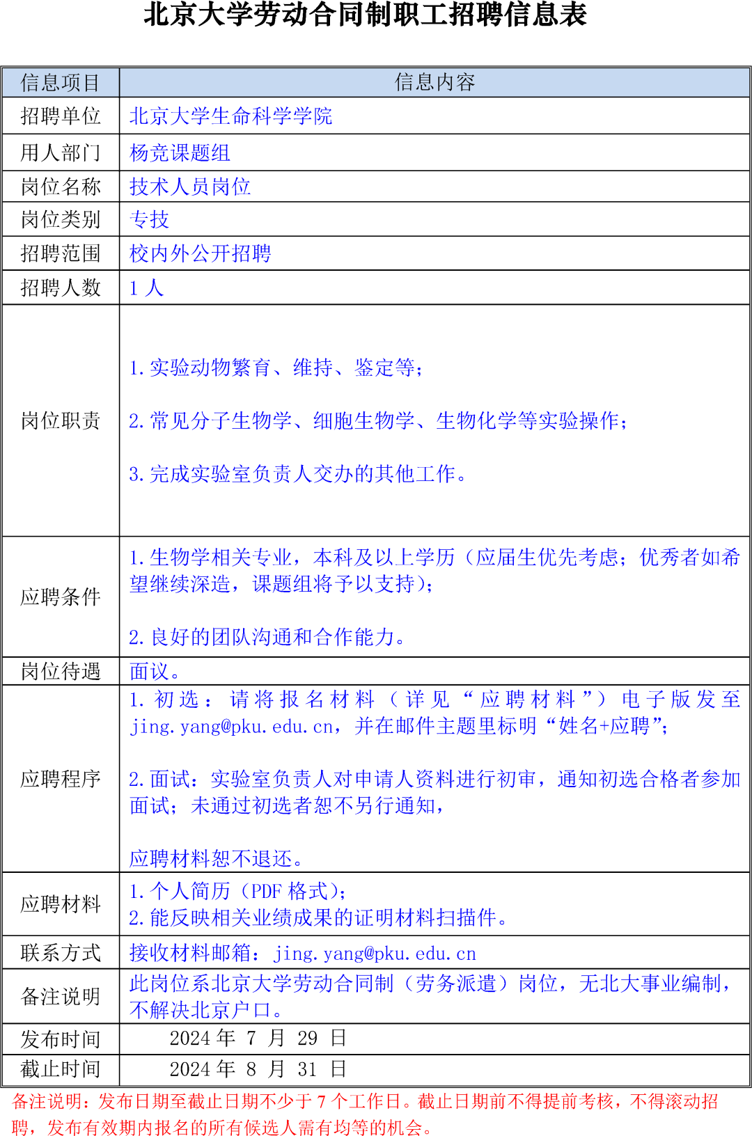 北京大学杨竞课题组2024年8月招聘1名技术人员