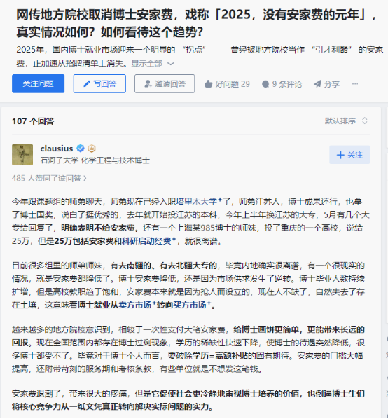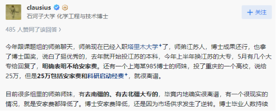 社交平台上有不少博士披露:地方很多院校正在降低安家费,甚至取消。(极大可能因为不缺人了,所以“砸钱买人”的时代过去了)。