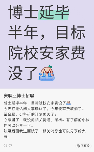 有博士在社交平台分享:因延毕了半年,目标院校今年已经取消了安家费……(太可惜了)
